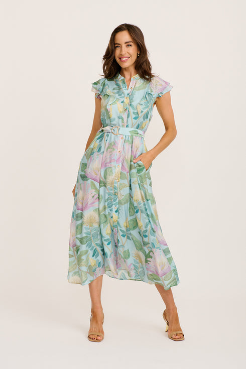 The relaxed yet refined design includes functional buttons, a self‑tie waist and full lining through the bodice and skirt for comfort. Ideal for warm-weather celebrations or dressed-down sophistication, this dress is a versatile piece that flatters and flows with natural ease.