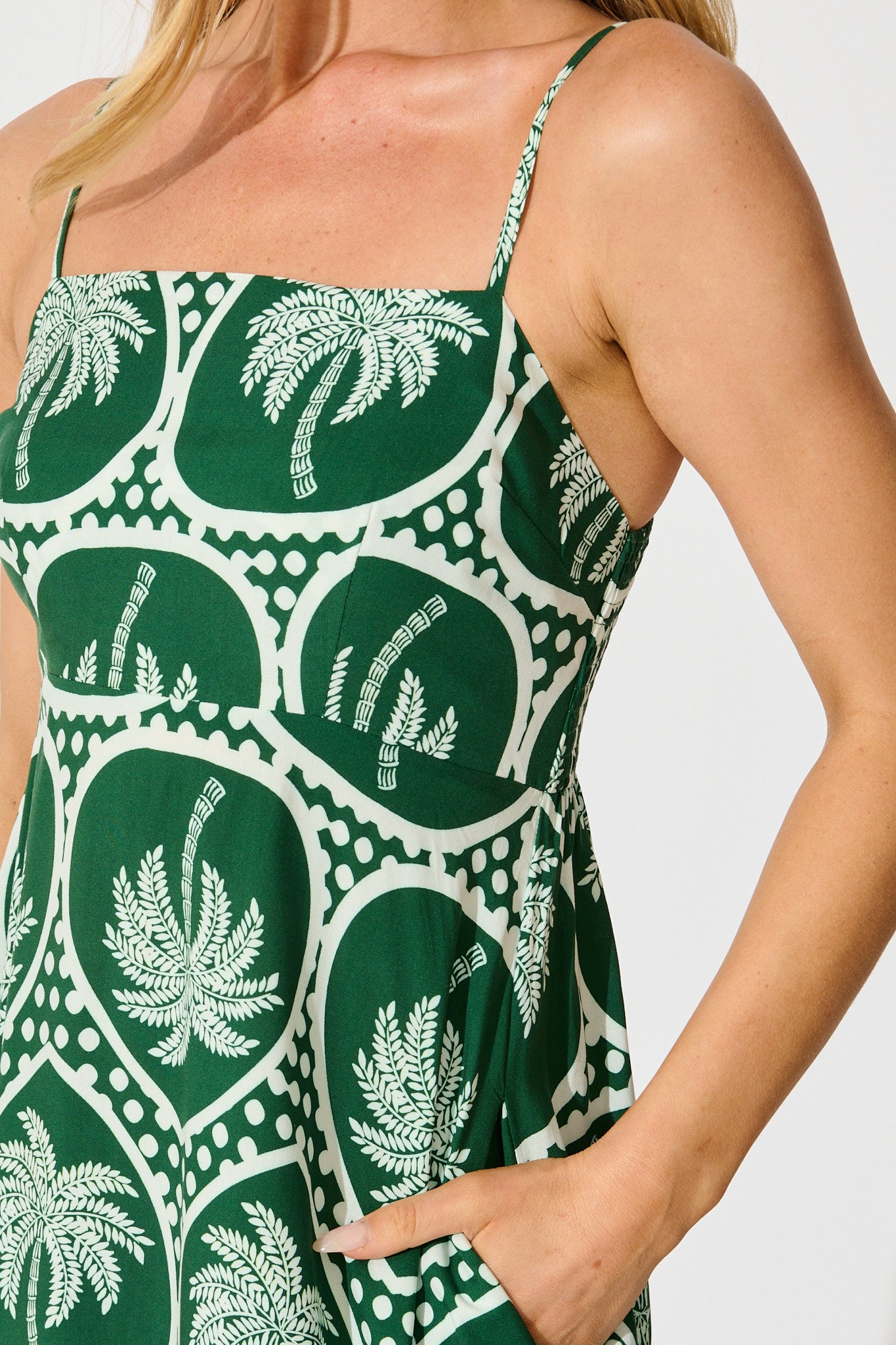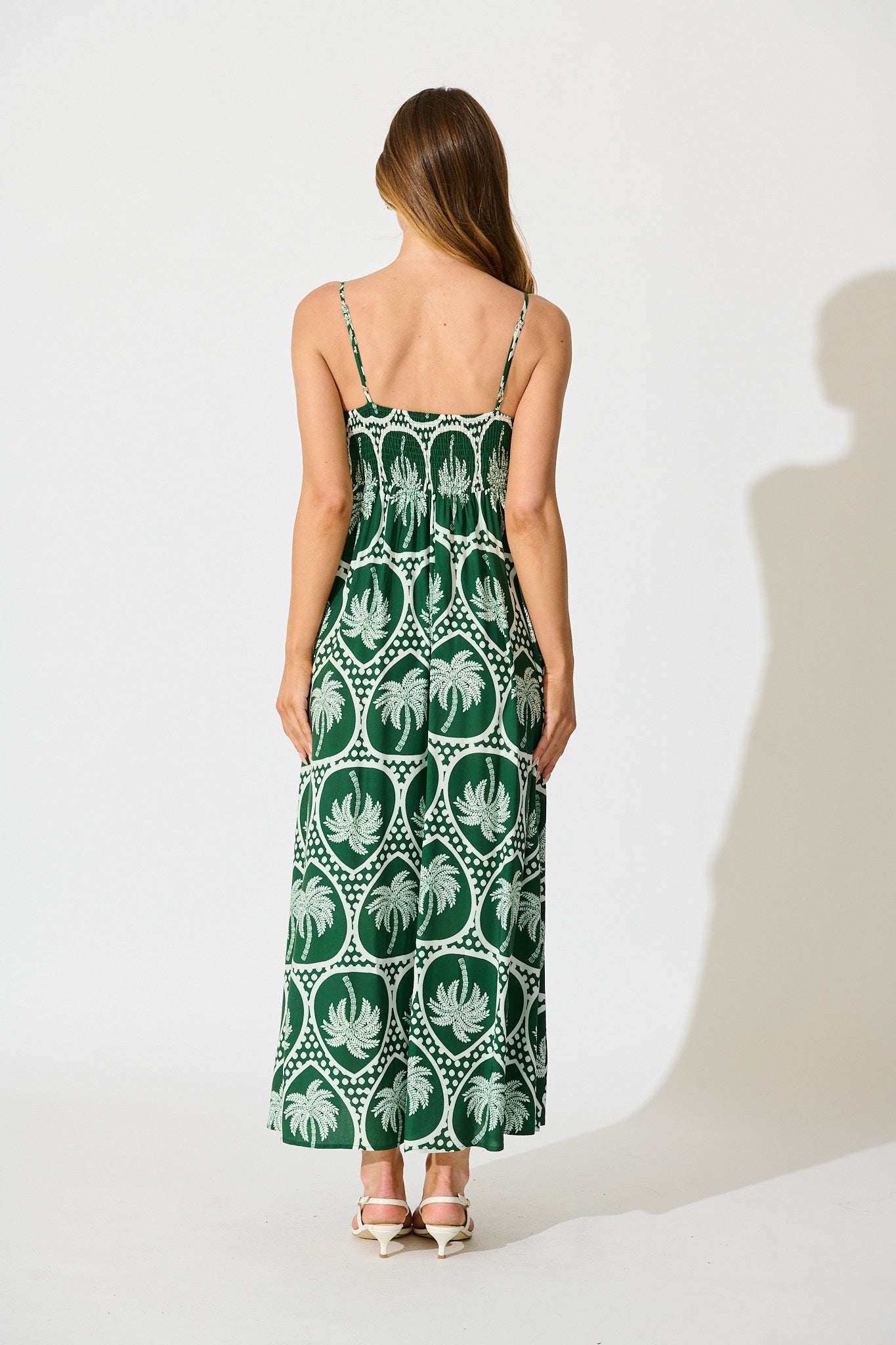 The Fayda Maxi Sundress in Green Palm Tree Tiles Print is your wardrobe’s getaway staple. With adjustable spaghetti straps and a shirred back bodice, this maxi dress blends laid‑back ease with tropical charm. It’s designed for sun‑soaked adventures and relaxed long lunches, bringing vibrant green tones and comfy simplicity into one stunning piece.