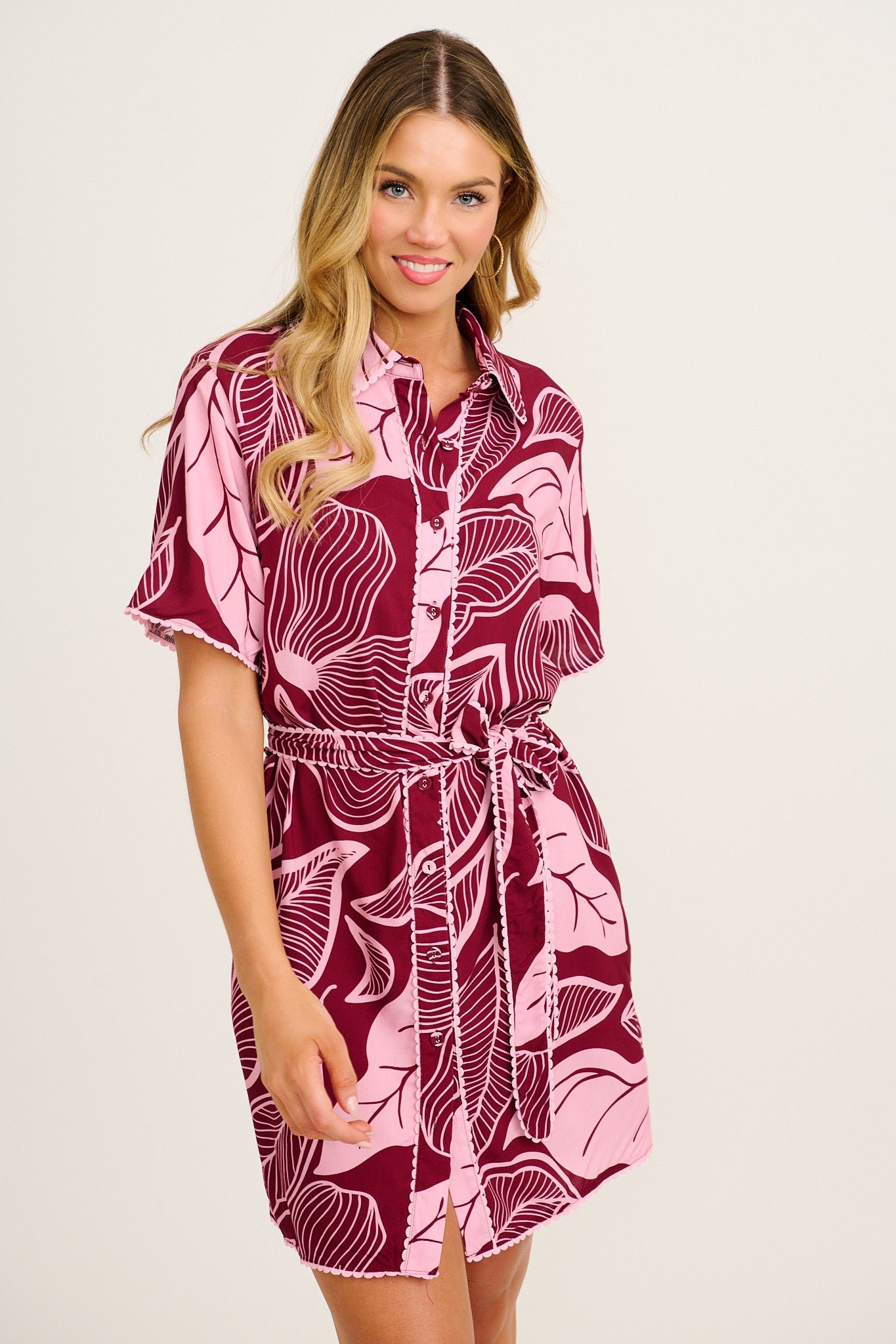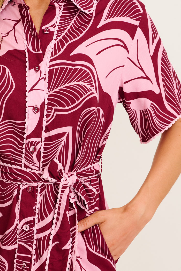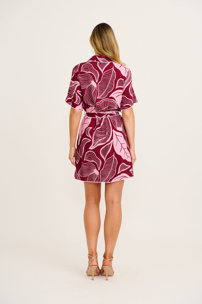 The Nerisa Shirt Dress in Plum with Pink Leaf is an effortlessly cool style with standout details. Ideal for warm days and relaxed events, this mini shirt dress is both flattering and functional.