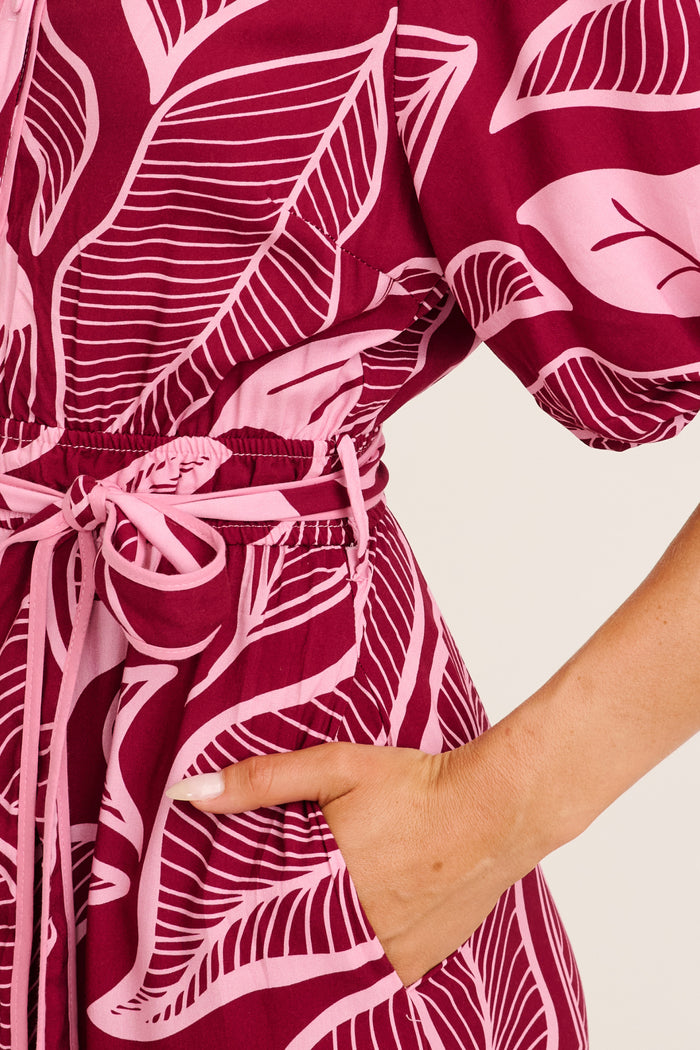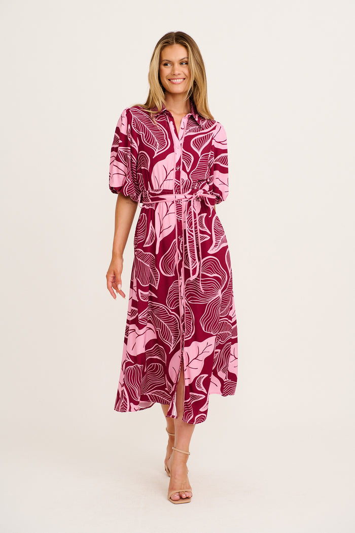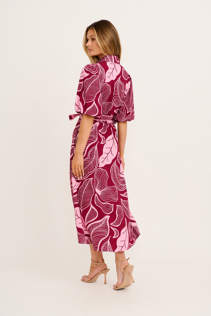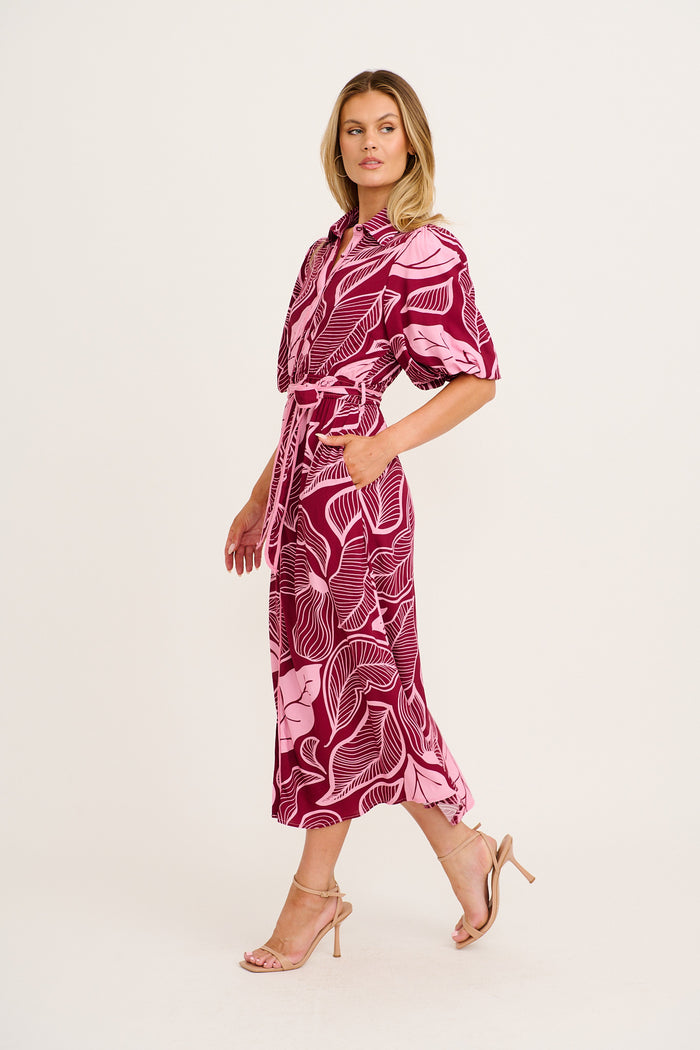 Reanna Midi Shirt Dress in Plum with Pink Leaf Print