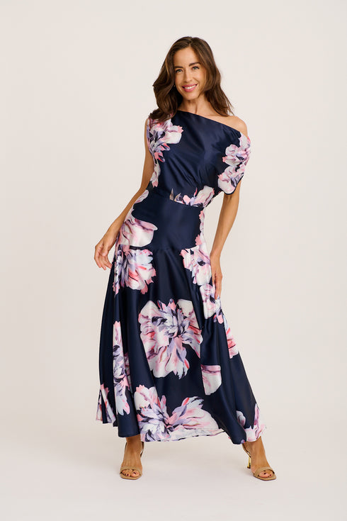 Spark Maxi Off Shoulder Dress in Navy Floral Satin